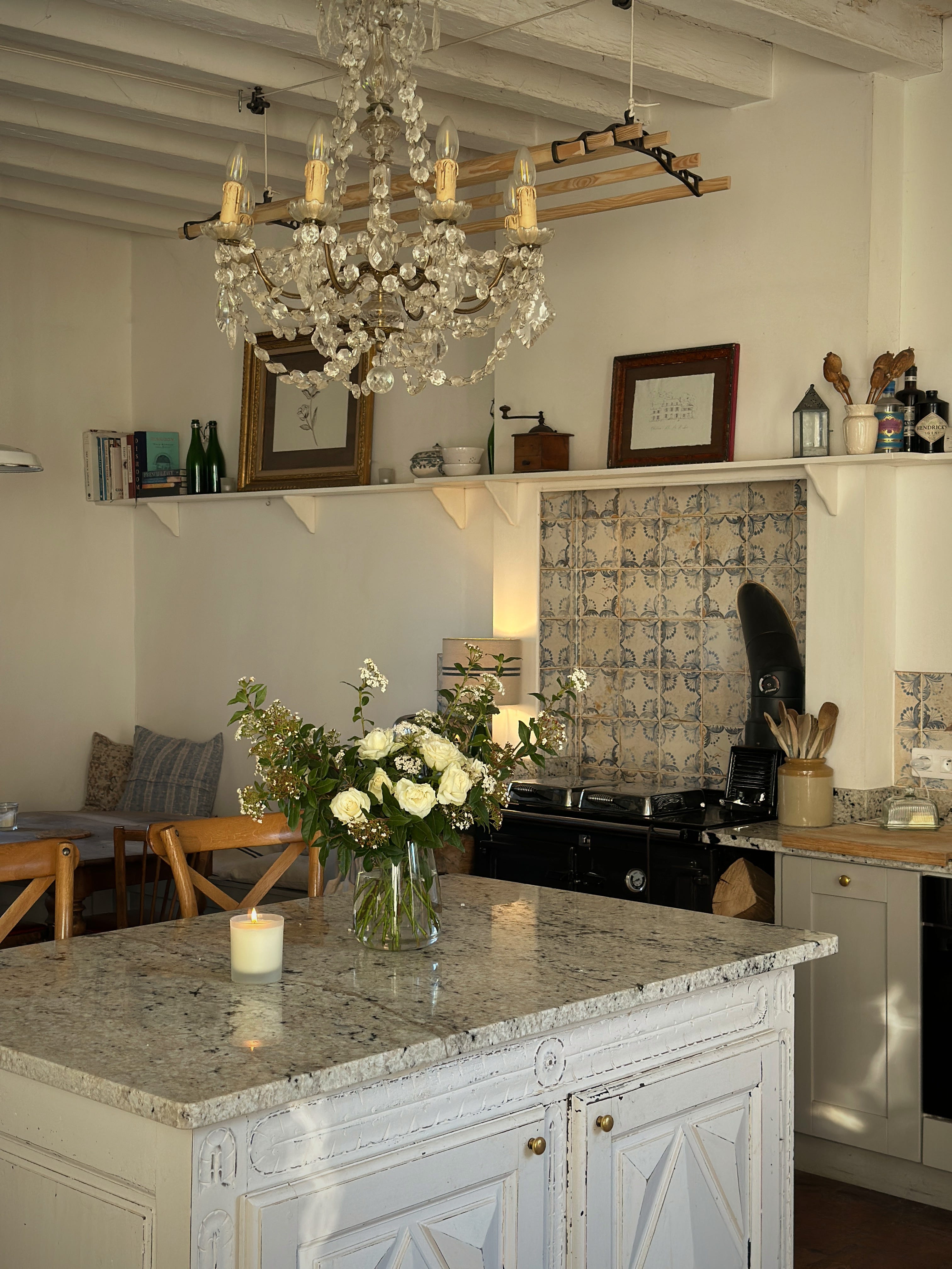 Carefully I strip the leaves from the viburnum tinus stems, the tiny petals from the flowers scattering over the worktop. I criss-cross the stems in the vase, creating some structure for the white roses Laurie’s bought me for Mother’s Day. A bouquet I can arrange myself is a perfect gift for me.