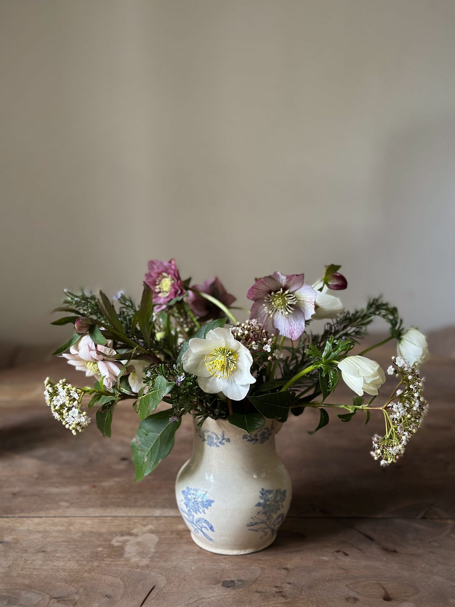 I fill a little cream and blue jug with water and quickly arrange the flowers, slitting the stems of the hellebores in the hopes that they’ll last as long as the anemones. It makes me happy that even in February I can fill a vase with flowers from garden, a reminder that all the hard work is worth it.
