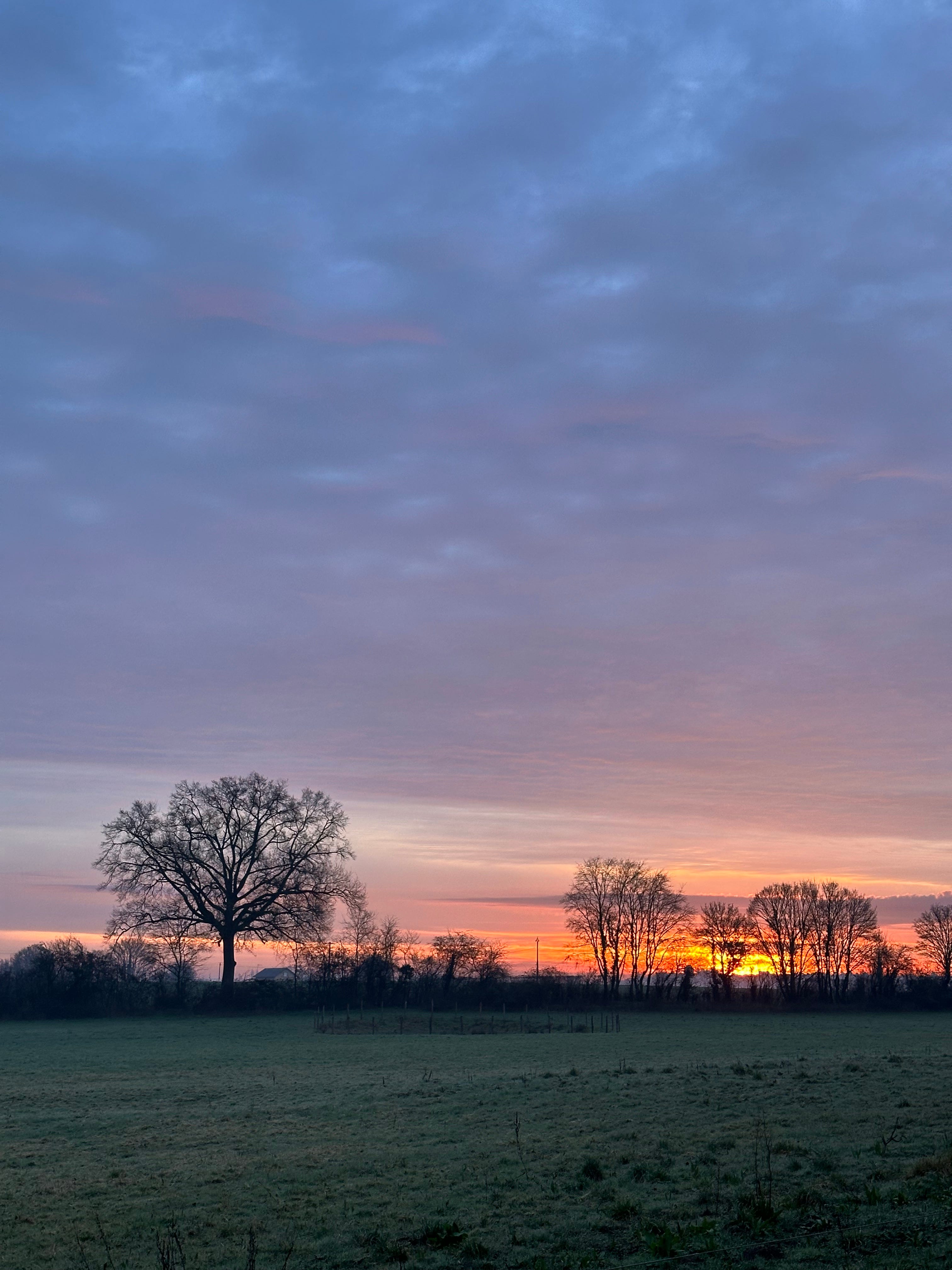 The sun is ablaze in a sliver of sky beneath the clouds, burning a liquid red like the heart of a fire, fading out into pinks and mauves, its heat quenched by a stratus of grey. It’s been a while since we’ve been treated to a sunrise and this is a special kind. One of those momentary sunrises that lasts only until it’s swallowed by the clouds, the sunlight smothered by another grey day. A treat for the early risers.